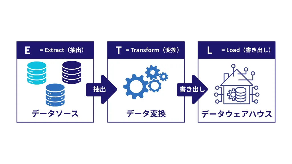 ETLは、以下の3つの頭文字を取った略称で、データ活用の基盤を支える中心的な役割を担っています。